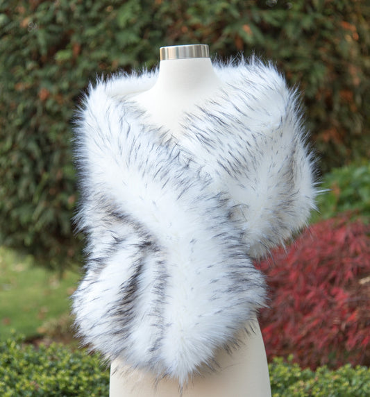 White faux fur wrap with black tips faux fur stole faux fur shawl bridal wrap faux fur shrug B005-white-black-tips